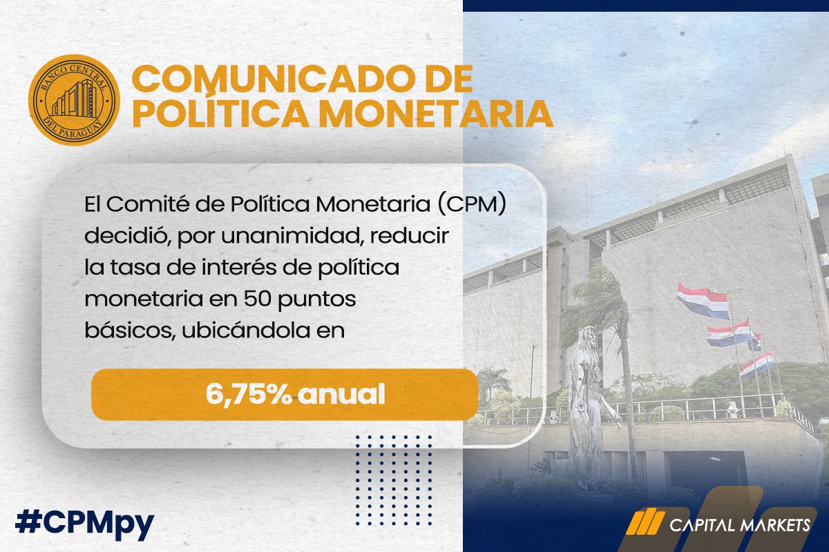 En su reunión de la fecha, el Comité de Política Monetaria (CPM) decidió, por unanimidad, reducir la tasa de interés de política monetaria en 50 puntos básicos (pb), de 7,25% a 6,75% anual.